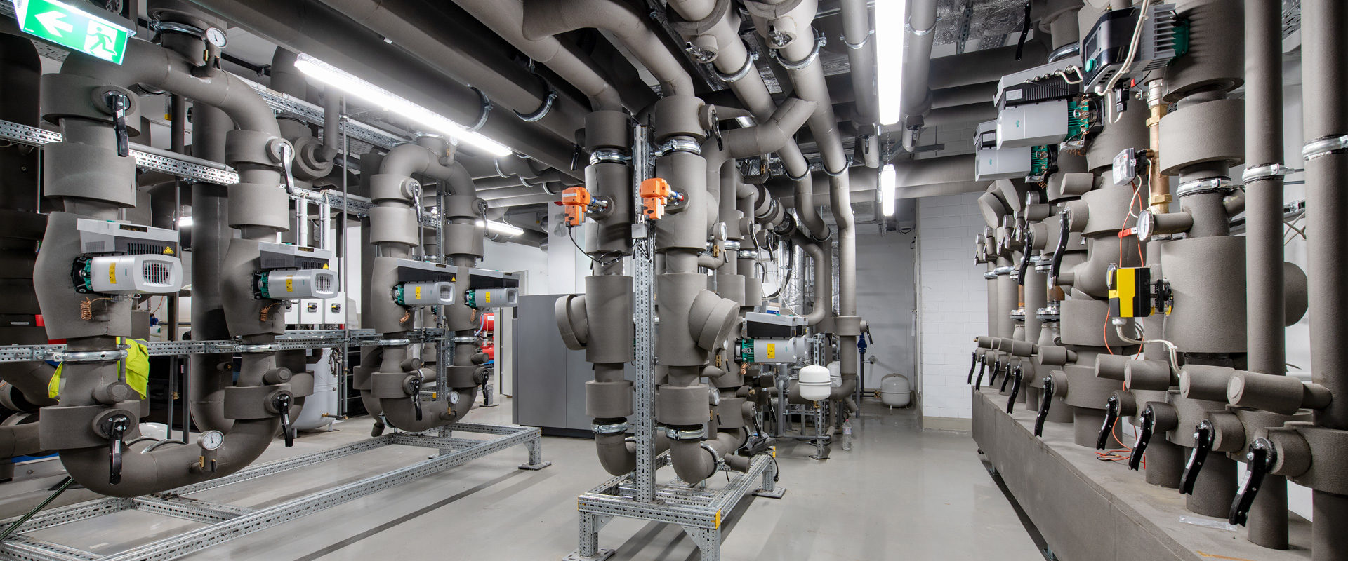Bei der Planung Ihrer neuen Heizzentrale haben Sie viele Auswahlmöglichkeiten, bei denen wir Sie gerne beraten. Die Kombinationen Wärmepumpe/Brennwertkessel, Wärmepumpe/BHKW oder konventioneller Erzeuger/Solarkollektor sind heute Standard. Wärmepumpen in Kaskade geschaltet decken schon mittlere Leistungsbereiche effizient ab. Regional unterschiedlich ist die Verwendung von fester oder flüssiger Biomasse. Auch die bekannte Fernwärmehausanschlussstation wird wegen des niedrigen Primärenergiefaktors, der Wert für die Effizienz der Energieerzeugung, von ca. 0,7 genutzt. Je niedriger der Primärenergiefaktor desto energiesparender und umweltschonender wird die Nutzenergie erzeugt.