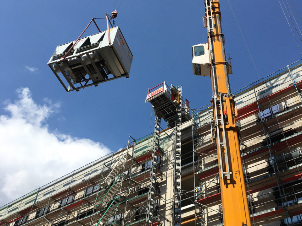 - Lüftungstechnische Anlage – Installation von insgesamt 18 RLT-Anlagen, teilweise auf dem Gebäudedach (wetterfeste Ausführung) zur Be- und Entlüftung der Treppenhäuser und